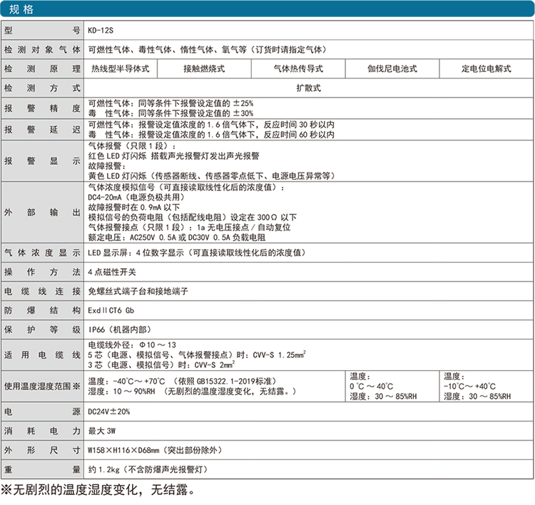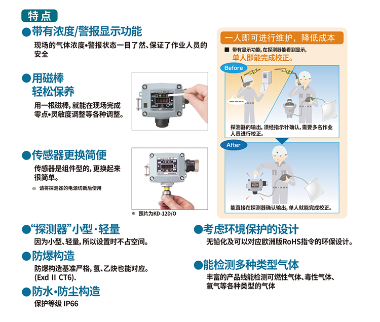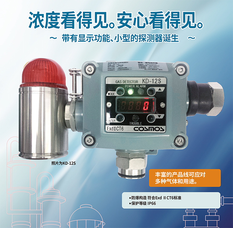 KD-12系列是一款數(shù)值顯示、聲光報(bào)警多種氣體檢測(cè)儀。殼體可搭載隔爆式聲光報(bào)警燈;帶濃度顯示功能,在現(xiàn)場(chǎng)可讀取濃度;使用磁棒操作,維護(hù)簡(jiǎn)單;單元式傳感器,方便替換;隔爆型外殼設(shè)計(jì) ExdII CT6;防水防塵構(gòu)造 保護(hù)等級(jí)IP66;輕量化設(shè)計(jì)采用免螺絲式端子臺(tái),接線簡(jiǎn)單基板電子部件和焊接實(shí)現(xiàn)無(wú)鉛化。用于燃?xì)狻⑹突ぁ⑵嚒⒋暗刃袠I(yè)。