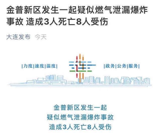 1月25日6時左右,金普新區(qū)友誼街道金渤海憬小區(qū)公建房附近發(fā)生燃氣爆炸事故,造成3人死亡,8人輕傷,受傷人員已全部進行救治。