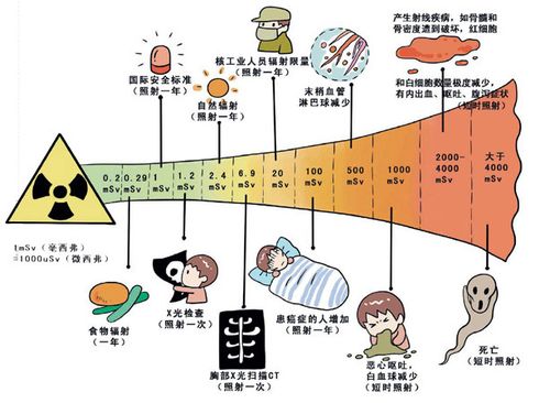 健康受損程度取決于暴露在輻射中的時(shí)間以及放射性物質(zhì)的衰變中產(chǎn)生電離輻射。它能破壞人體組織里分子和原子之間的化學(xué)鍵,可能對(duì)人體重要的生化結(jié)構(gòu)與功能產(chǎn)生嚴(yán)重影響。
