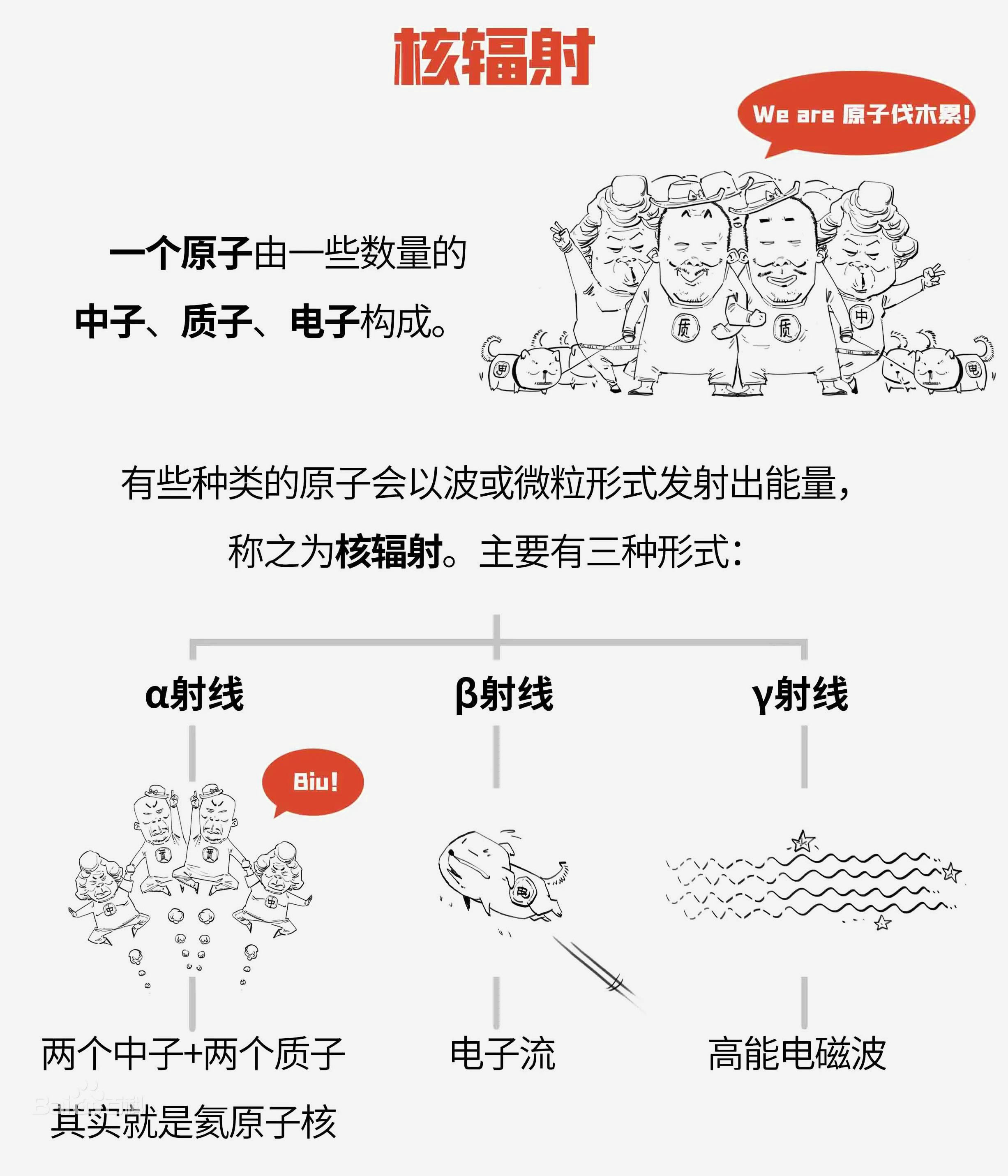 放射性物質(zhì)以波或微粒形式發(fā)射出的一種能量就叫核輻射,核爆炸和核事故都有核輻射。核輻射主要是α、β、γ三種射線: